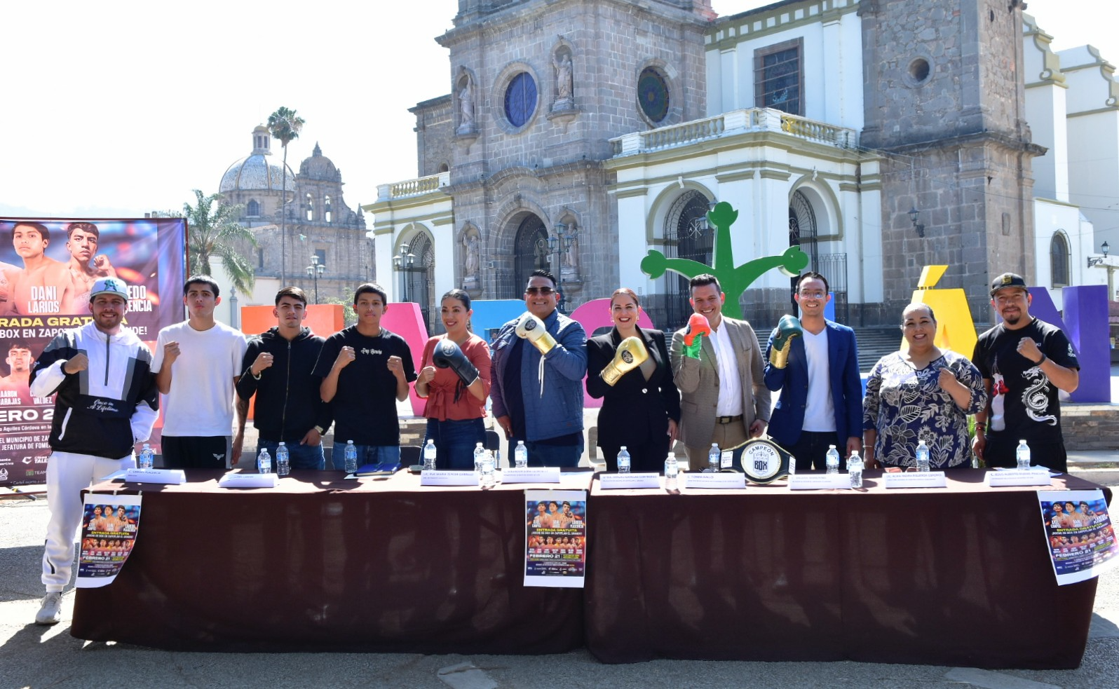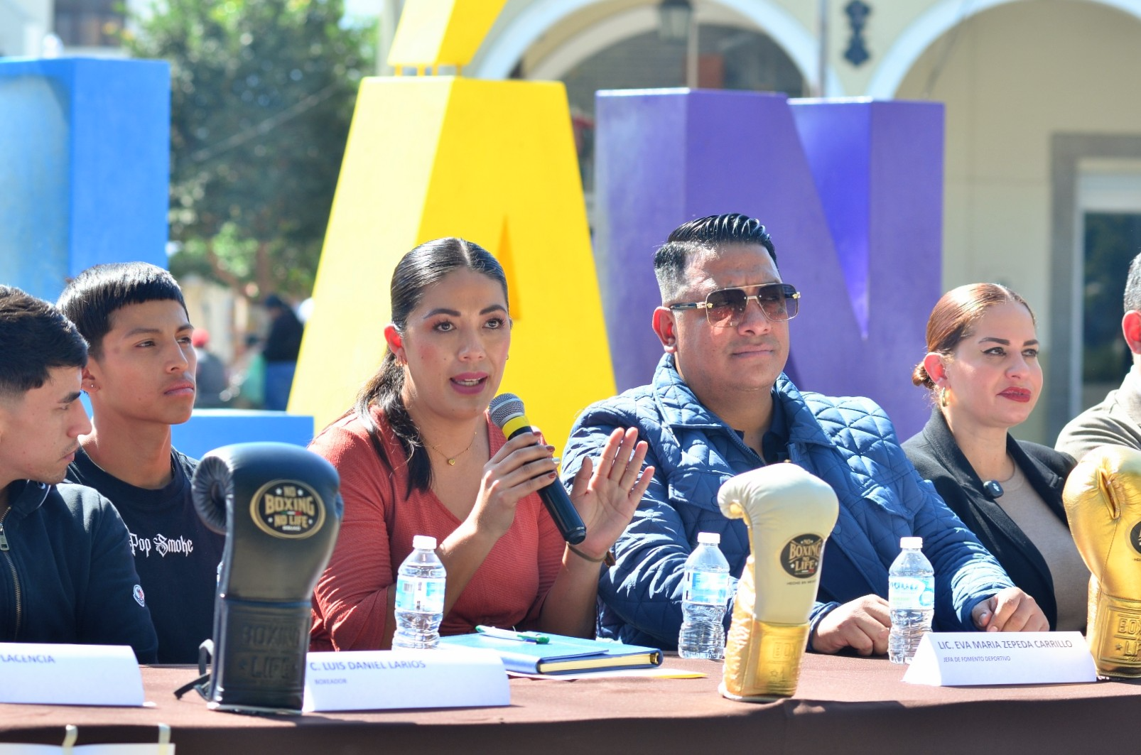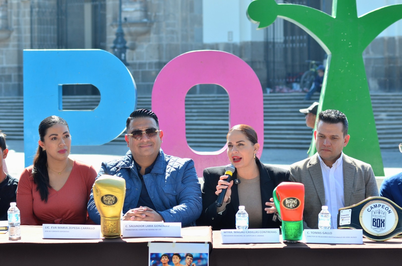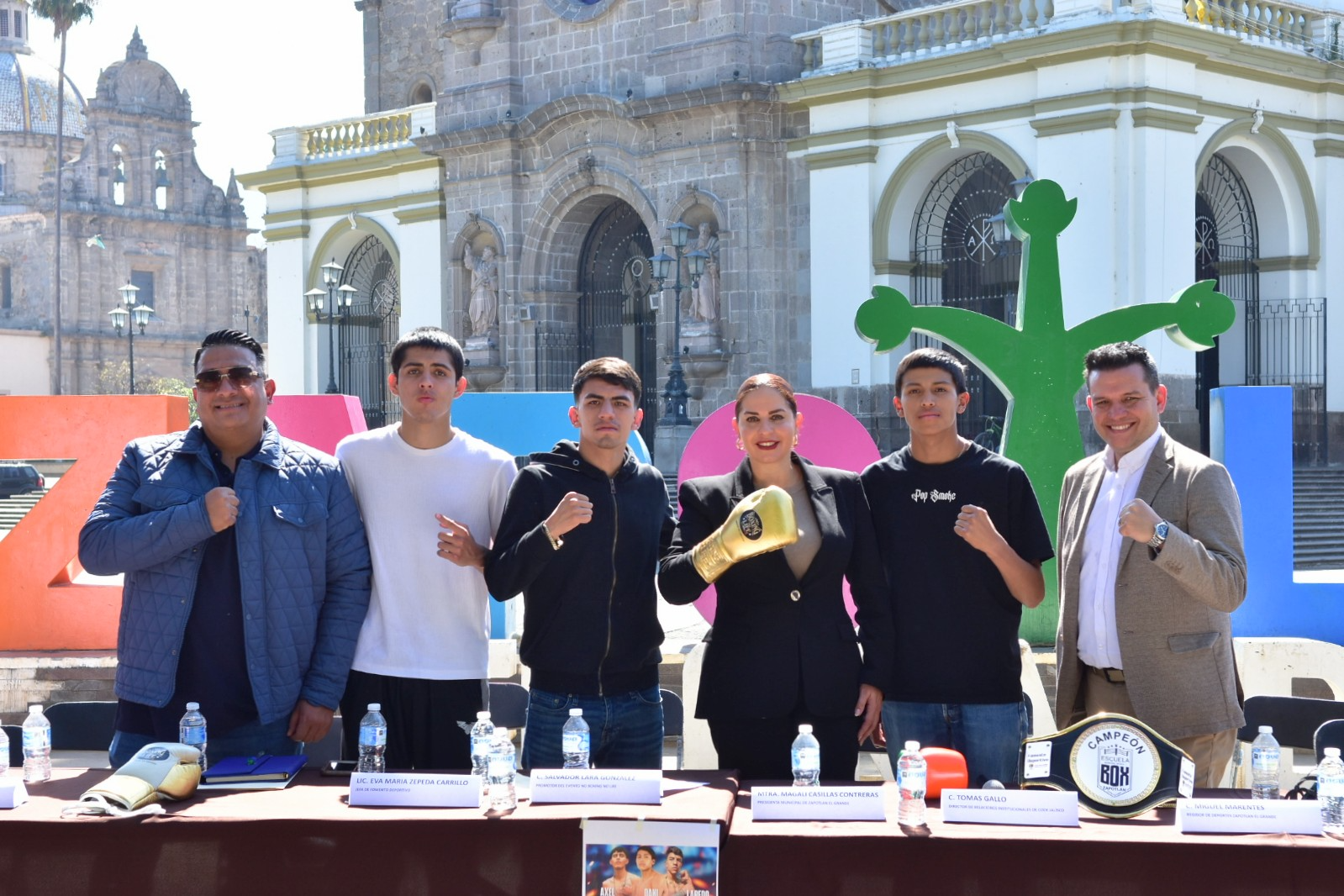 Los boxeadores Axel Campos, Daniel Larios y Samuel Plasencia; Jesús Alberto Pascual Rivera, entrenador de la Escuela Municipal de Box; Alma Yadira Figueroa Coronel, directora general de Construcción de Comunidad; Eva María Zepeda Carillo, jefa de Fomento Deportivo; Salvador Lara González, representante de Clase y Talento; Tomás Gallo, en representación de Fernando Ortega, director del CODE Jalisco; Miguel Marentes, regidor del Ayuntamiento; y Magali Casillas Contreras, presidenta de Zapotlán el Grande encabezaron esta reunión con los medios de comunicación.