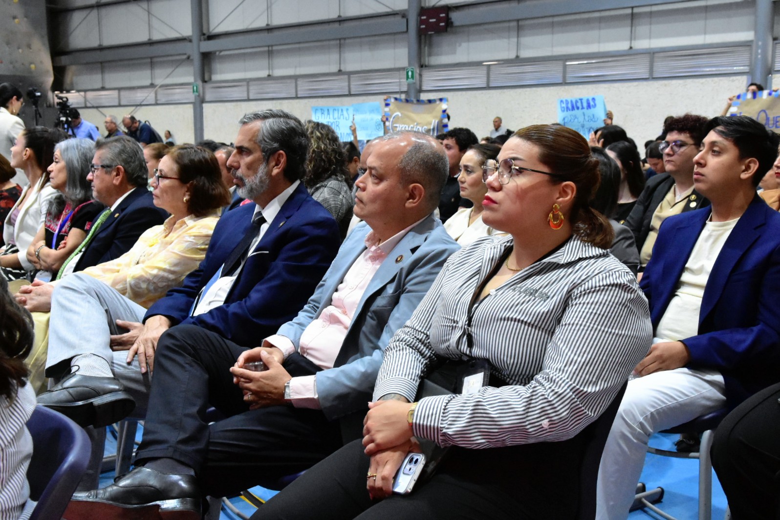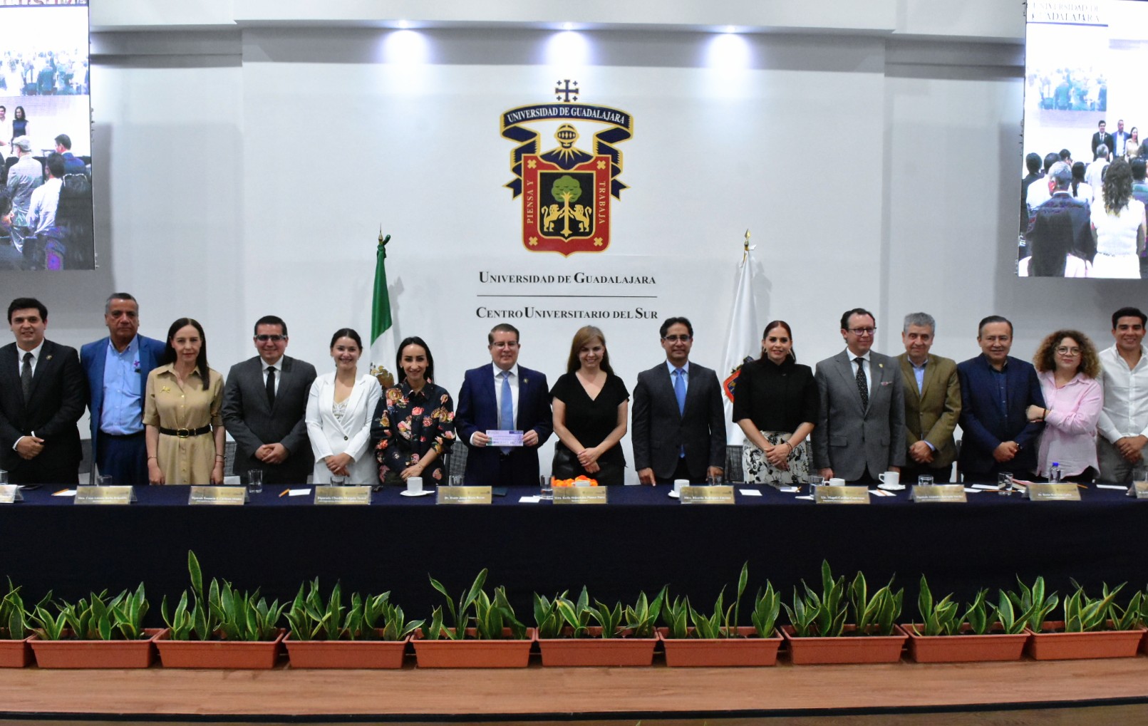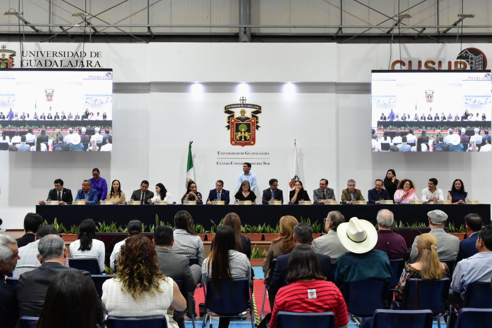 El presídium estuvo conformado por; Karla Alejandrina Planter Pérez, rectora general de la Universidad de Guadalajara; Ricardo Rodríguez Jiménez, subsecretario de educación superior del gobierno del Estado en representación de Pablo Lemus Navarro, gobernador Constitucional del Estado de Jalisco; Magali Casillas Contreras, presidenta municipal de Zapotlán el Grande; Claudia Murguía Torres, representante del Congreso del Edo de Jalisco; Alejandro Barrgán Sáchez; Tonantzin Elosai Cárdenas Méndez; Héctor Raul Solis Gadea, vicerrector ejecutivo de la Universidad de Guadalajara; Cesar Antonio Barba Delgadillo, secretario general de la Universidad de Guadalajara; Jaime Federico Andrade Villanueva, vicerrector adjunto y de investigación de la Universidad de Guadalajara; María Guadalupe Escobed, vicerrectora adjunta administrativa de la Universidad de Guadalajara; Dante Jaime Haro Reyes, Rector del Centro Universitario del Sur; Erika Natalia Juárez Miranda, secretaria general del Sindicato Único de trabajadores de la Universidad de Guadalajara; Alberto Salazar, secretario de organización y representante personal de José de Jesús Becerra Santiago, secretario general del sindicato único de trabajadores de la Universidad de Guadalajara; Leonardo Muñiz Copel, vicepresidente de la Federación Estudiantil y Universitaria; José de Jesús Chávez Cervantes, secretaria académico del Centro Universitario del Sur y Mariana Elizabeth Domínguez Cobian, secretaria administrativa del Centro Universitario del Sur.