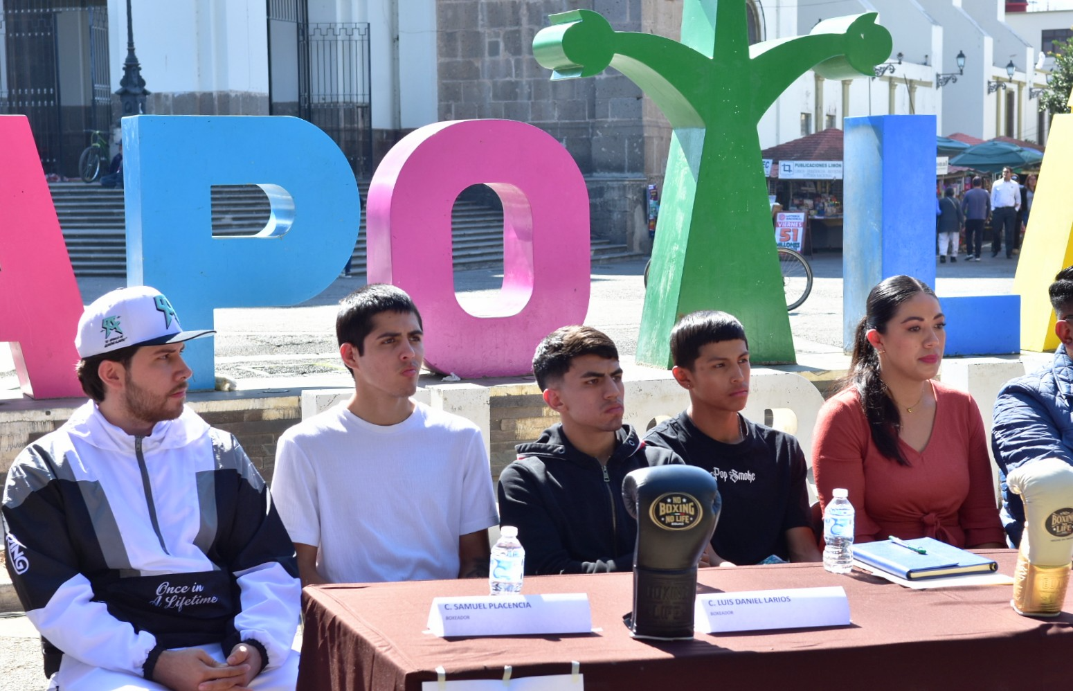 Los boxeadores Axel Campos, Daniel Larios y Samuel Plasencia; Jesús Alberto Pascual Rivera, entrenador de la Escuela Municipal de Box; Alma Yadira Figueroa Coronel, directora general de Construcción de Comunidad; Eva María Zepeda Carillo, jefa de Fomento Deportivo; Salvador Lara González, representante de Clase y Talento; Tomás Gallo, en representación de Fernando Ortega, director del CODE Jalisco; Miguel Marentes, regidor del Ayuntamiento; y Magali Casillas Contreras, presidenta de Zapotlán el Grande encabezaron esta reunión con los medios de comunicación.