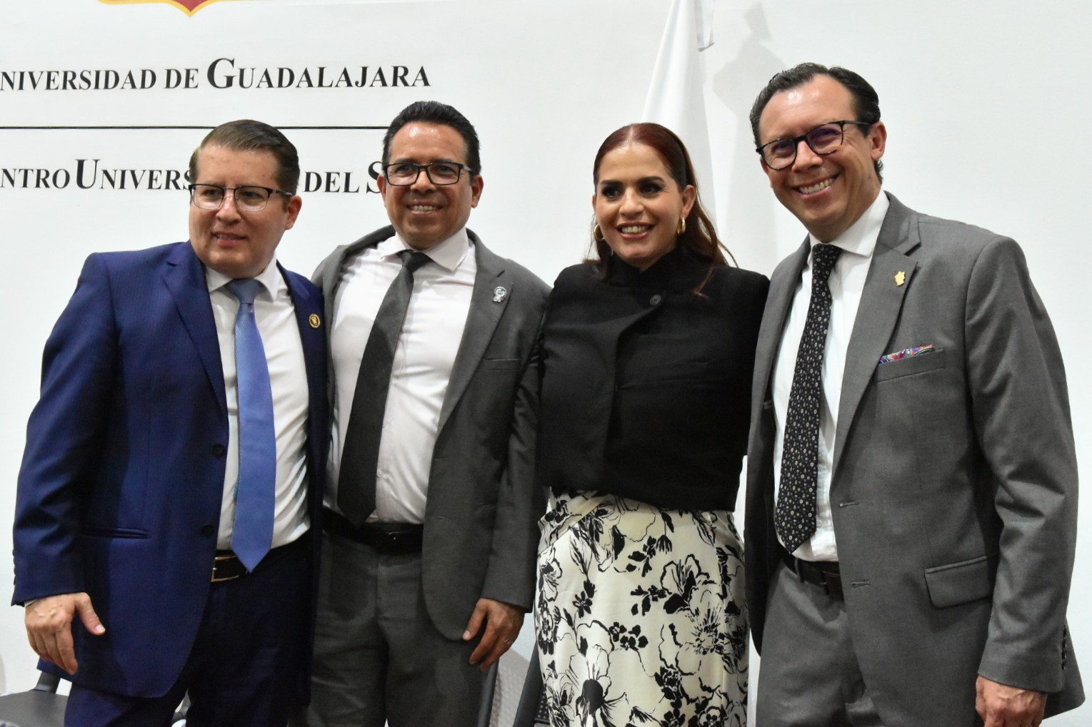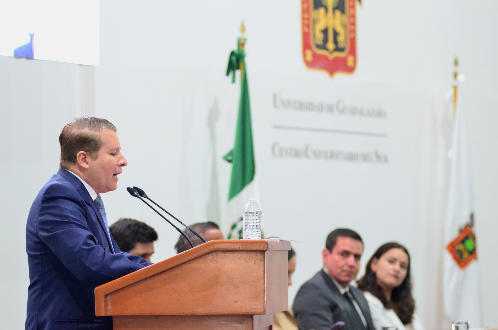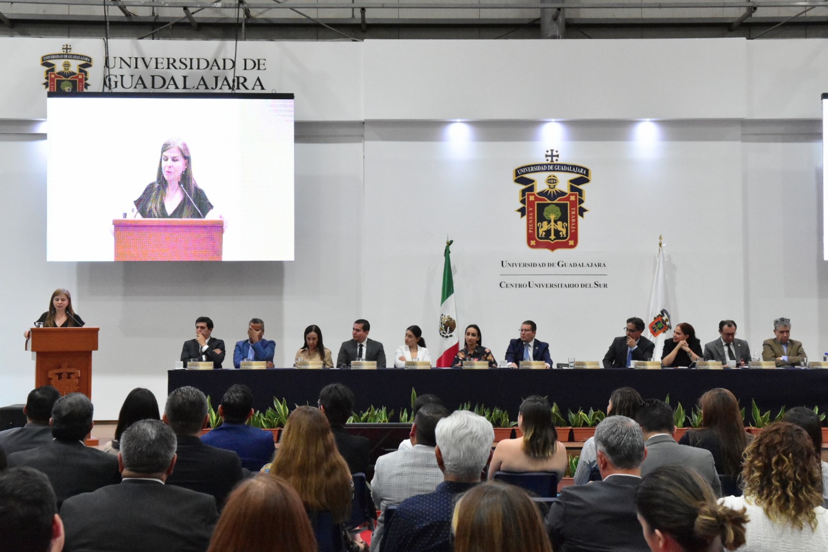 El presídium estuvo conformado por; Karla Alejandrina Planter Pérez, rectora general de la Universidad de Guadalajara; Ricardo Rodríguez Jiménez, subsecretario de educación superior del gobierno del Estado en representación de Pablo Lemus Navarro, gobernador Constitucional del Estado de Jalisco; Magali Casillas Contreras, presidenta municipal de Zapotlán el Grande; Claudia Murguía Torres, representante del Congreso del Edo de Jalisco; Alejandro Barrgán Sáchez; Tonantzin Elosai Cárdenas Méndez; Héctor Raul Solis Gadea, vicerrector ejecutivo de la Universidad de Guadalajara; Cesar Antonio Barba Delgadillo, secretario general de la Universidad de Guadalajara; Jaime Federico Andrade Villanueva, vicerrector adjunto y de investigación de la Universidad de Guadalajara; María Guadalupe Escobed, vicerrectora adjunta administrativa de la Universidad de Guadalajara; Dante Jaime Haro Reyes, Rector del Centro Universitario del Sur; Erika Natalia Juárez Miranda, secretaria general del Sindicato Único de trabajadores de la Universidad de Guadalajara; Alberto Salazar, secretario de organización y representante personal de José de Jesús Becerra Santiago, secretario general del sindicato único de trabajadores de la Universidad de Guadalajara; Leonardo Muñiz Copel, vicepresidente de la Federación Estudiantil y Universitaria; José de Jesús Chávez Cervantes, secretaria académico del Centro Universitario del Sur y Mariana Elizabeth Domínguez Cobian, secretaria administrativa del Centro Universitario del Sur.
