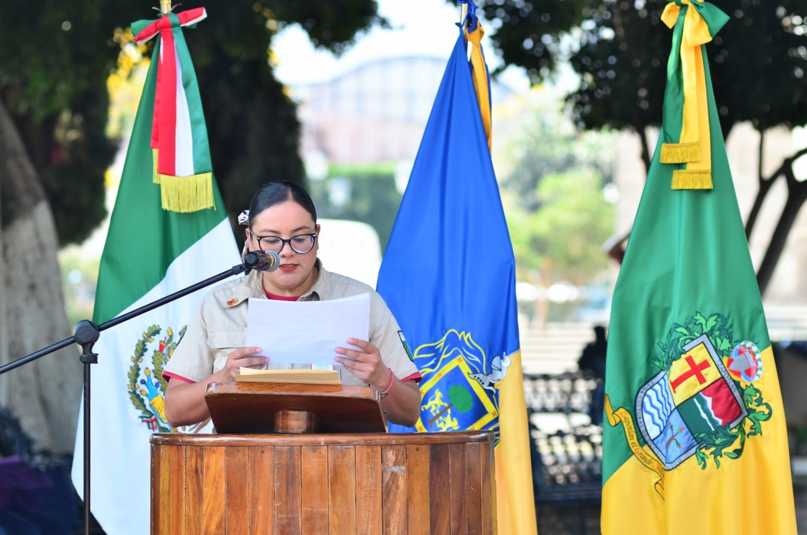 La ceremonia se realizó en la explanada cívica “Benito Juárez” del Jardín Principal, dando inicio con Honores a la Bandera a cargo de la escolta de Seguridad Pública Municipal y la Entonación del Himno Nacional Mexicano.